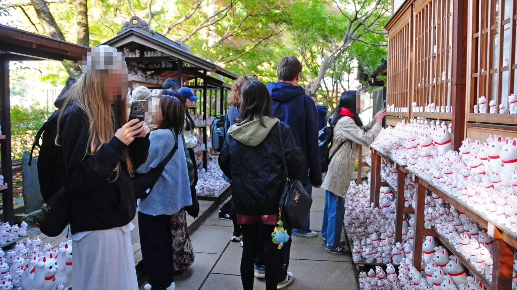 豪徳寺を訪れた人が最も驚くのが、やはり「招福殿(しょうふくでん)」の横にある「奉納所」です。ここには、願い事が叶った人々がお礼として奉納した、大小さまざまな「招き猫」が、文字通り“びっしり”と並んでいます。その数、数千とも数万とも…!